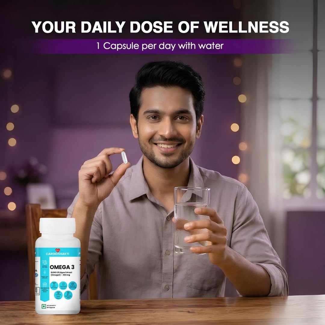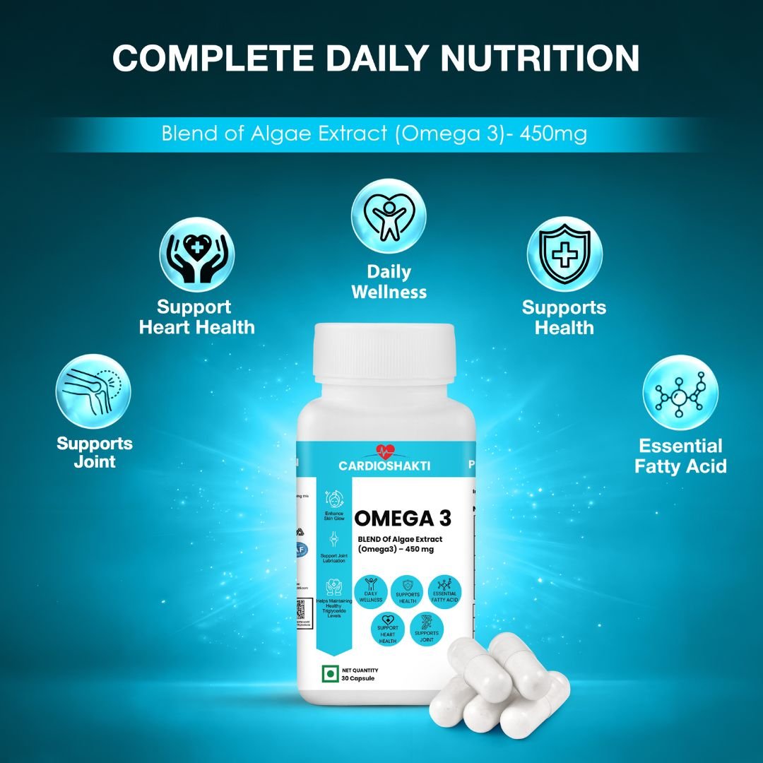 CardioShakti Omega 3 is a vegetarian, algae-derived supplement providing high-quality DHA and EPA without fish oil.