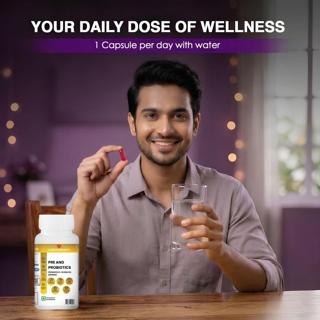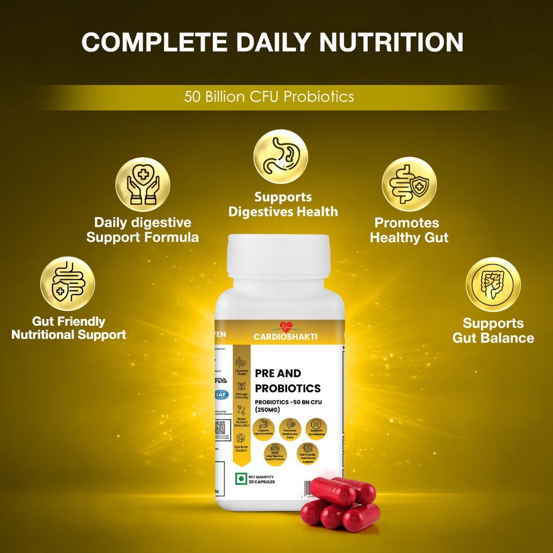 CardioShakti Pre & Probiotics delivers a high-potency blend of 50 Billion CFU from 11 carefully selected probiotic strains, designed to support digestive balance and immune health.
